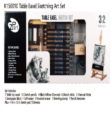 1 Table top easel 12 Sketch pencils 4 Black Willow Charcoals 6 Sketch sticks 3 Charcoal Sticks