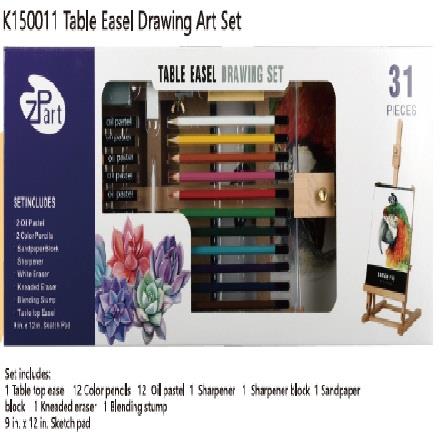 1 Table top easel 12 Color pencils 12 Oil pastel 1 Sharpener 1 Sharpener block 1 Sandpaper